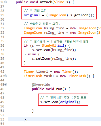 - 두번째 네모 : 불붙은 이미지 아이콘을 설정하는 코드입니다. 슬라임에 따라 설정됩니다.